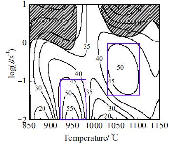 This figure shows the corresponding processing diagram of Ti80 alloy when the true strain is 0.9. The shaded part in the figure is the rheological instability area, and the number on the contour line represents the power dissipation coefficient (η). The greater the value of η, the greater the proportion of energy dissipated by the evolution of the organization, and the greater the change in the organization's morphology.