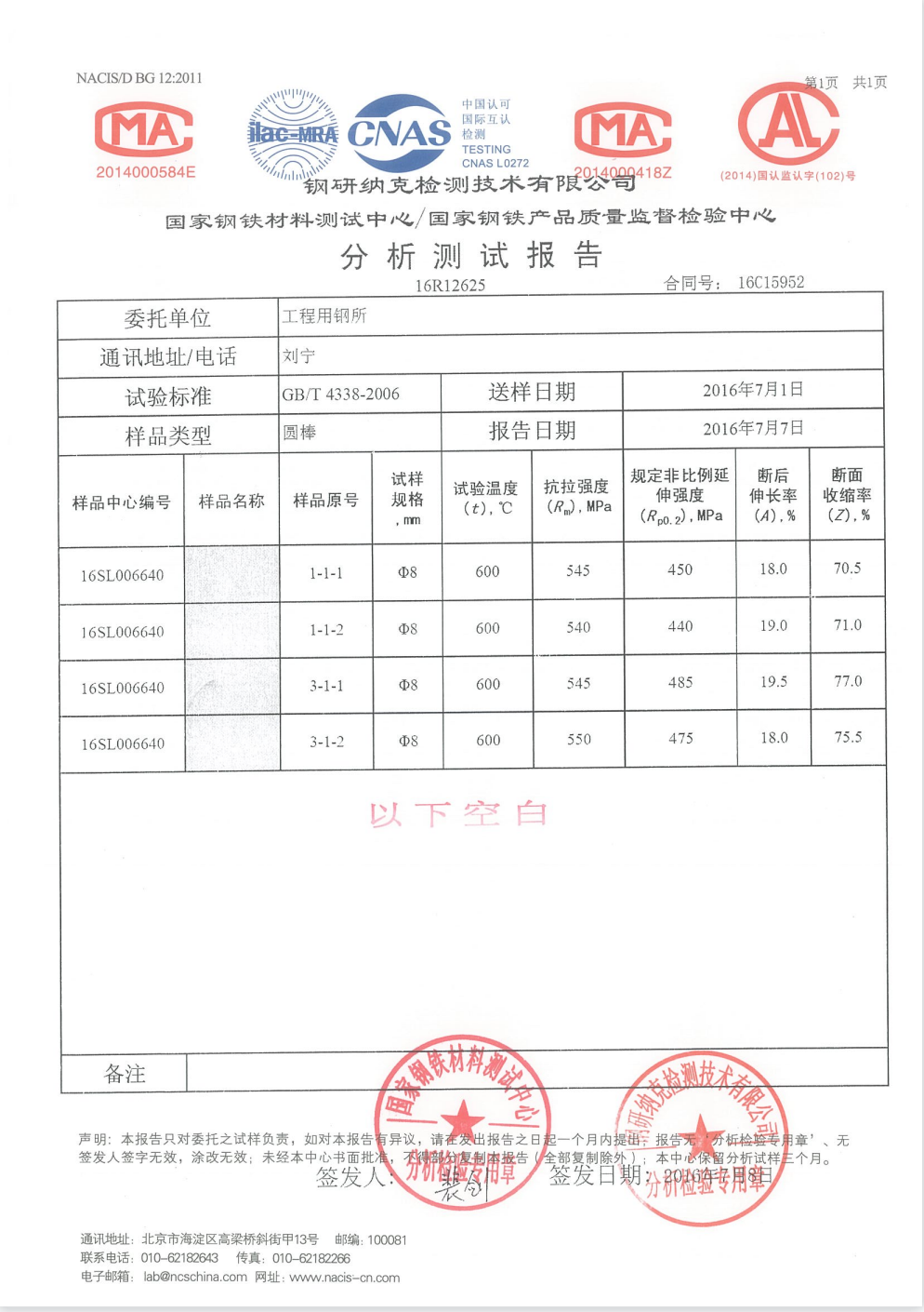 In this study, after the tensile specimen was heated to 600℃ for 3 hours on a universal tensile test machine equipped with an electric furnace, the high temperature tensile test was carried out according to GB/T 4338-2006. The high temperature tensile strength and yield strength of the round rod were 550MPa and 475MPa respectively.