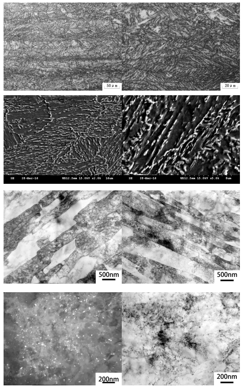 The metallographic samples were pre-ground on a pre-grinding machine, then water-ground on sandpaper no. 150, 320, 600 and 1000 successively, and then mechanically polished on a polishing machine. After polishing, the samples were immersed in a mixed solution of 4 mL nitric acid (HNO3) + 96 mL anhydrous ethanol (CH3CH2OH) for 10~20 s. The metallographic structure was observed by Olympus GX53 optical microscope. After 730℃1hWQ+680℃1hAC, the microstructure is martensitic. SEM samples were pre-ground on a pre-grinding machine, and then waterground on sand paper 150, 320, 600 and 1000 in turn. After mechanical polishing on a polishing machine, they were immersed in 4 mL HNO3 + 96 mL CH3CH2OH mixed solution for 15-25 s. FEI Quanta650 thermal field emission scanning electron microscope was used to observe the appearance, size and distribution of Martensite. The slats are smaller. TEM samples were prepared by wire cutting 0.3mm thin slices from the corresponding parts of the sample to be analyzed. The thin slices were reduced to less than 50 μm by water milling. At -20~-15℃, the thin slices were double-sprayed with 6 mL perchloric acid (HClO4) +94 mL CH3CH2OH with a double injection current of 50 mA. FEI Tecnia G 20 transmission electron microscope (EDS) was used to observe the samples after double spraying. A large number of nano-scale precipitates appeared in the matrix.