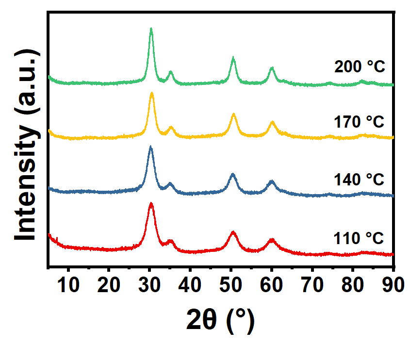 The basic zirconium carbonate and the prepared sodium hydroxide solution are transferred to a hydrothermal reactor. The reaction kettle was heated at 110, 140, 170 and 200 ℃ for 6 h to form the crystal structure of ZrO2. Then its XRD pattern was tested