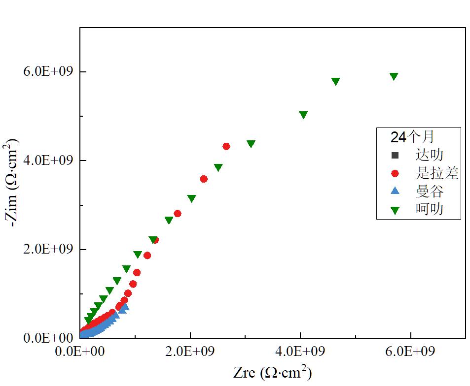 说明 : 涂层-图片3-丙烯酸24月能奎斯特图。在3.5% NaCl溶液中进行了电化学阻抗谱测试。