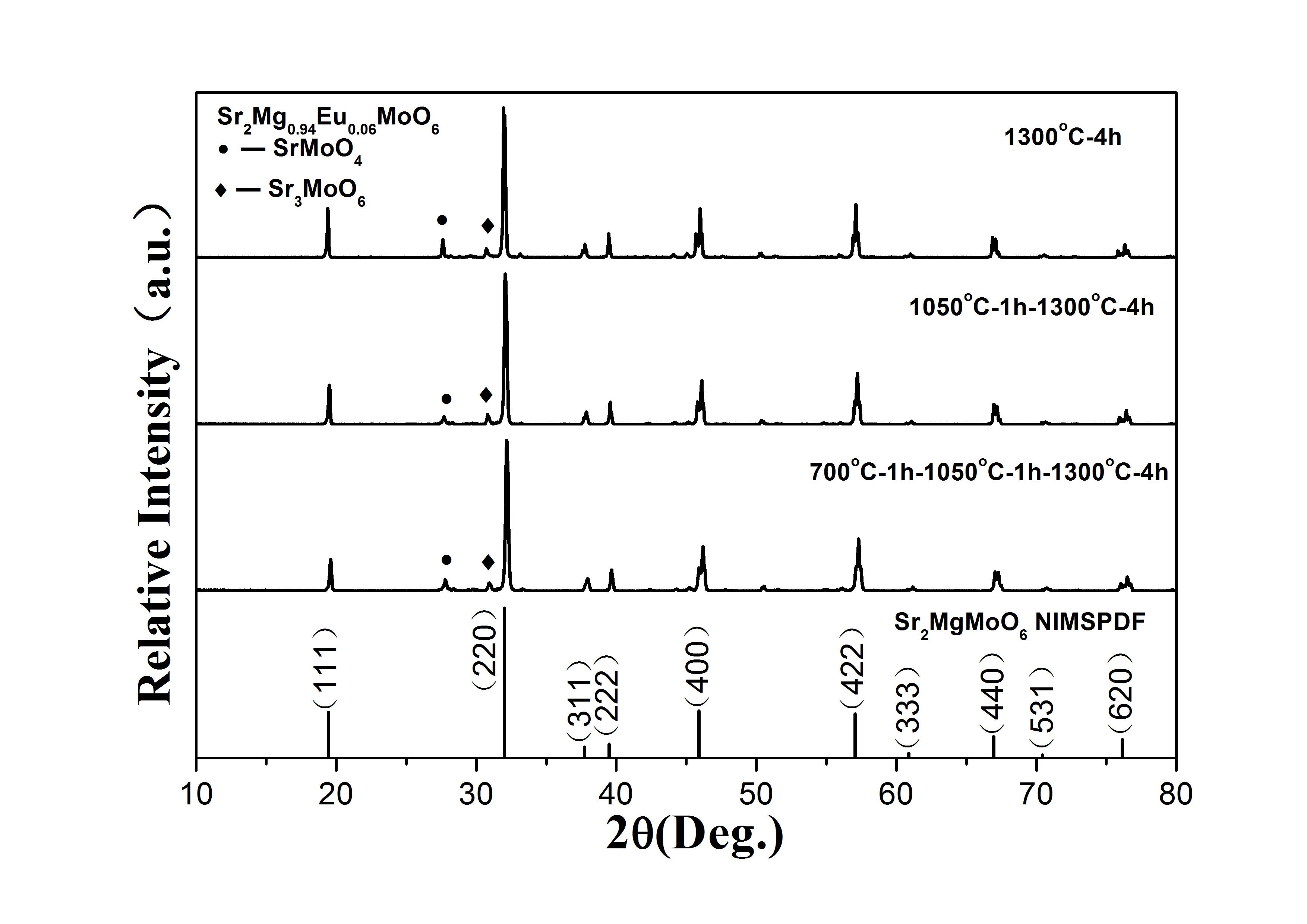 The preparation of three samples under different calcination system formed Sr2MgMoO6 main phase.