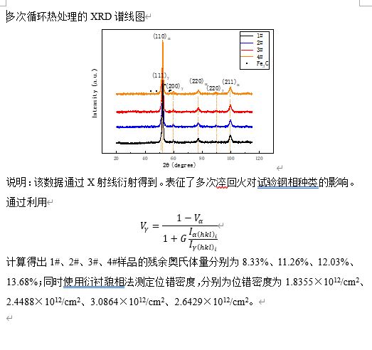 The residual austenite content of 1 #, 2 #, 3 # and 4 # samples is 8.33%, 11.26%, 12.03% and 13.68% respectively; At the same time, the dislocation density is measured by the diffraction contrast profiling method, which is 1.8355×1012/cm2、2.4488×1012/cm2、3.0864×1012/cm2、2.6429×1012/cm2