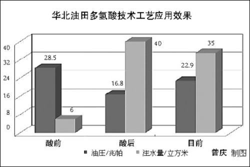 2013年,技术人员借助华北油田“注水基础年”,经过近一年不断攻坚克难,研发出适合华北油田低孔低渗砂岩油藏注水井降压增注的绿色环保多氢酸酸化工艺技术,“复合有机膦酸酸能力强,逐步释放氢离子,在地层中始终保持低浓度鲜酸,处理半径可达10至20米。”