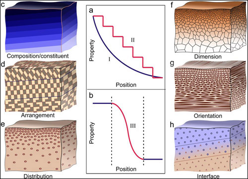 图2. 功能梯度材料中局域性能与位置的关系以及天然生物材料中的基本功能梯度设计形式与原则