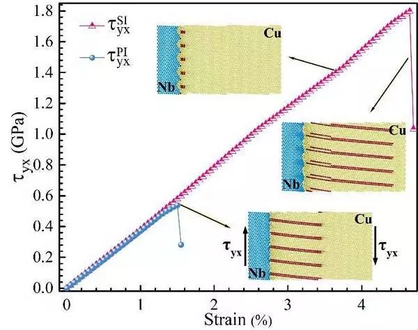 图十:沿x[111]Cu方向剪切的两种Cu{112}//{112}Nb界面的应力-应变曲线
