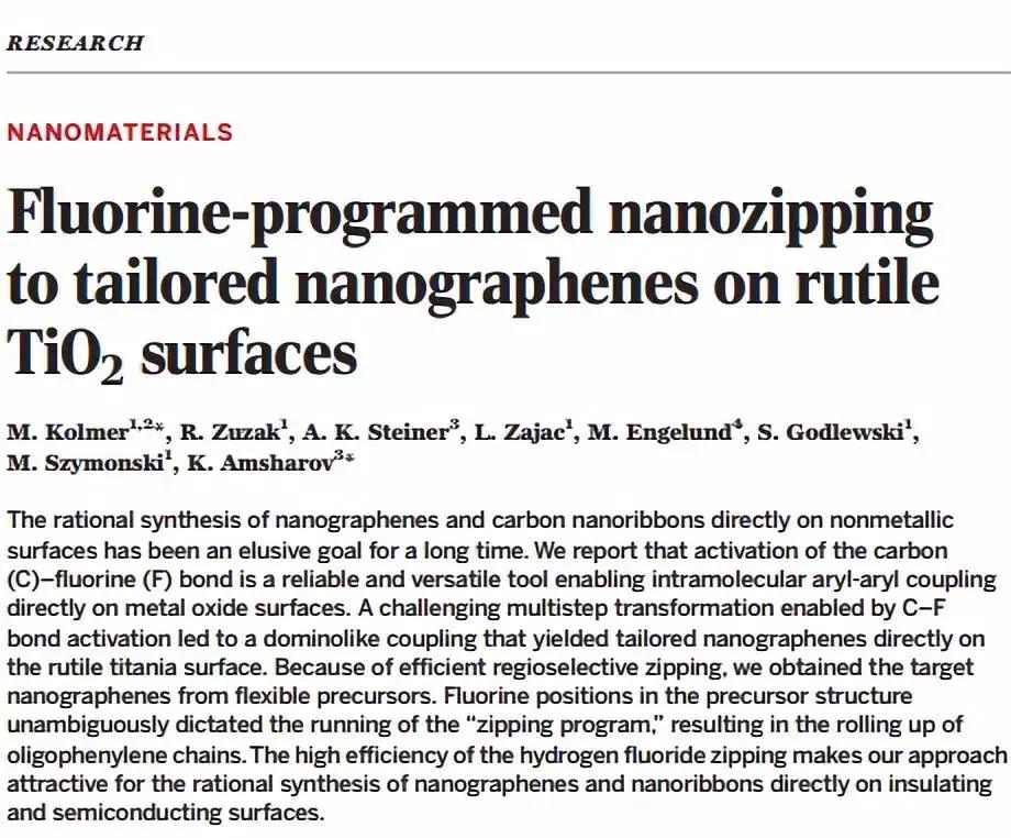 近日,波兰雅盖隆大学和美国橡树岭国家实验室M. Kolmer教授和德国埃朗根-纽伦堡大学K. Amsharov团队的科研人员在《Science》上联合发表了题为“Fluorine-programmed nanozippingto tailored nanographenes on rutile TiO2 surfaces”的研究论文。研究人员发现C(碳)-F(氟)的活化是一种可靠且通用的工具,能够直接在金属氧化物表面实现分子内芳基-芳基耦合。由C-F键活化实现的多步转化导致了多米诺式的耦合,并直接在金红石型TiO2表面生成了定制的石墨烯。由于有效的区域选择性拉链,可以从柔性的多环芳烃前驱体中获得目标石墨烯。前驱体结构中F的位置决定了“拉链程序”的运行,从而导致了低聚亚苯基链的卷起。结果表明金红石型TiO2表面参与了前驱体的环脱氢氟化反应,并反映了环脱氢氟化在这一过程中的关键作用。