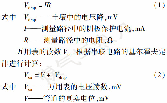 管道施加阴极保护后,阴极保护电位测量见图1。电位测量回路中,除防腐层破损点的电位V外,还包含阴极保护电流在土壤中产生的电压降Vdrop,计算式为: