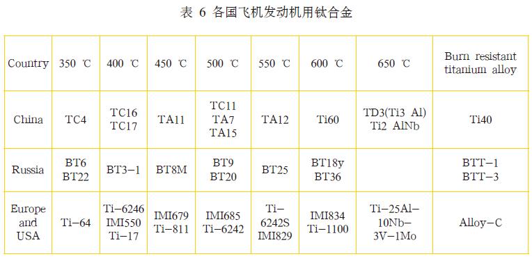 α+β 型钛合金不仅具有良好的热加工性能,而且在中高温环境下还具有良好的综合性能。因此,α 型、近α 型和α+β 型钛合金被广泛应用于航空发动机。表6 所列为世界各国研制的飞机发动机用钛合金。