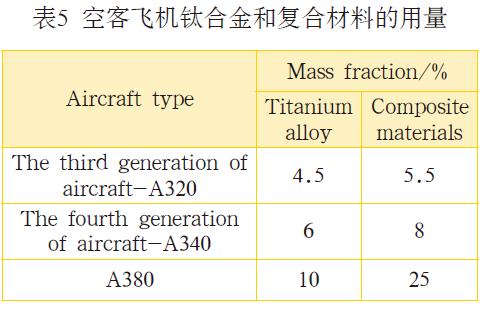 进入20 世纪80 年代后,民用飞机用钛逐步增加,并已超过军用飞机用钛。飞机越先进,钛用量越多。表3~5 所列分别为美国第3 代、第4 代战斗机及先进轰炸机、运输机用钛材的质量分数 、一般飞机使用的钛合金种类和空客飞机钛合金和复合材料的用量。由表5 可知,空客A380 飞机上的钛材使用量已达10%,钛材已经成为现代飞机不可缺少的结构材料。根据用途不同,可将航空用钛合金分为飞机发动机用钛合金、飞机机身用钛合金和航空紧固件用钛合金。近年来,人们对航空用钛合金在上述 3 个方面的应用进行了深入研究。