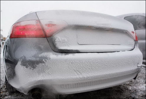 (十二)、在冬季行车,往往遇着先是雨夹雪,后又是气温骤降,车身漆膜会浮上一层薄冰和积雪。这时可用蒸汽洗车或热水洗车机进行冲洗,然后擦干即可;此外,浮雪可用高压水冲洗。