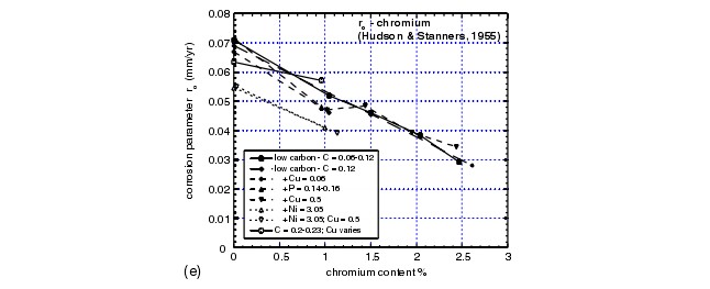 ①少量合金元素对提高钢在海水全浸区的耐蚀性有良好的效果,提高钢的耐蚀性的合金元素有Cr、Al、Si、P、Cu、Mn、Mo、Nb、V等;