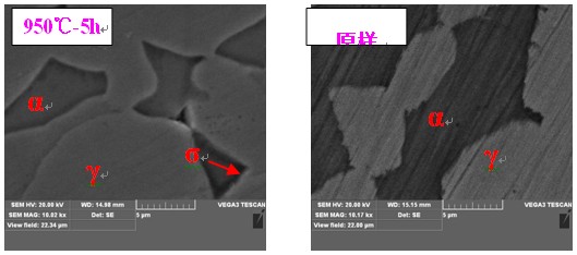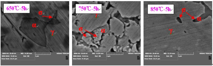 (1) 650~950℃保温时,随着温度的升高,σ相含量增加,850℃时达到峰值,加热到950℃,σ析出相减少。