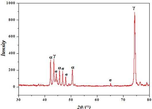 表1为EDS对组成相的化学成分分析,可以看出σ相中Cr、Mo元素的质量分数分别为31.31%、6.24%,远远超过了基体中Cr、Mo的含量。说明σ相本身就是一种富Cr富Mo相,它的析出必然会造成周围组织贫铬贫钼,从而严重影响基体原有的耐孔蚀性能。图3为试样经850℃加热2 h热处理后的XRD 分析图,可见组成相为铁素体α、奥氏体γ和σ相。