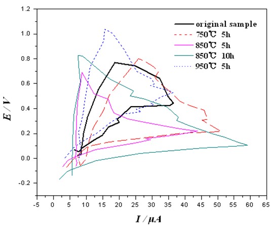 采用标准的三电极体系,2205双相不锈钢试样为工作电极,工作面积为7.5mm × 7.5mm,辅助电极为金属Pt电极,参比电极为饱和甘汞电极(SCE),采用2273PARSTAT电化学综合测试系统,扫描速度为20 mV /min用动电位扫描法,测定了经不同热处理的试样在3.5%NaCl、30 ± 0.5℃的溶液中的阳极极化孔蚀环扫描曲线,孔蚀环的面积越大,孔蚀电位与孔蚀回归电位差值越大,不锈钢的孔蚀抗力越低。