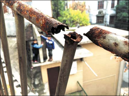 近期,在湖南长沙天心区一处人流巨大的人行台阶上,水泥护坡布满裂缝,最宽处已有两三厘米,其间还分布多个引水管。在护坡上方,有一道约1米高的铁护栏,长达10余米,大多数地方已锈迹斑斑,因年久失修,五六处接口已腐蚀断裂,另外一些断裂的接口被细铁丝连在一起。