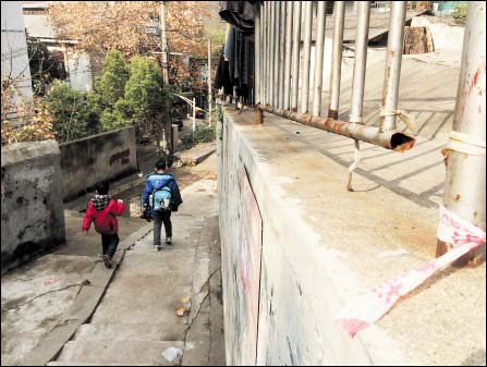 就在这道护栏旁边,一群中午放学的小学生正在玩耍,有学生不时背靠护栏,使得整道护栏摇晃不已。据同学说,去年隔壁班的学生从护栏一块近半米宽的缺口,掉下去骨折了。记者顺着手指的方向可以看到栏杆处少了一根铁杆,离下方台阶约有2米高。