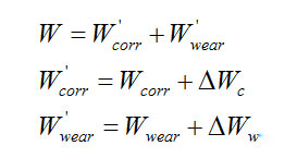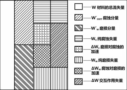 式中,W-磨损造成的材料的总流失量,W‘corr-磨损条件下的腐蚀分量,W’wear-磨损条件下的磨损分量,Wcorr-纯腐蚀失重(静态腐蚀),ΔWc-磨损对腐蚀的加速(腐蚀增量),Wwear-纯磨损失重,ΔWw-腐蚀对磨损的加速(磨损增量)。