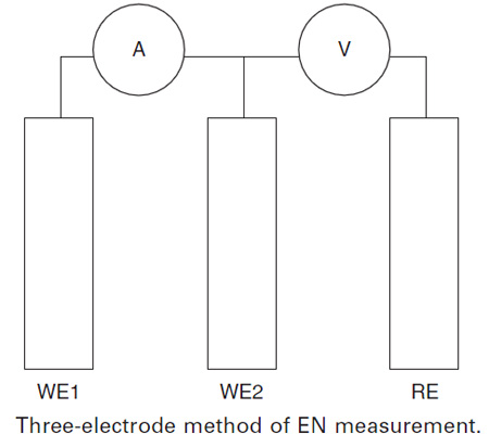 如果ECN作为两个相同工作电极之间的电流被测量,这种工作电极组合的电位可通过测量与另一参比电极或第三工作电极之间的电位而得到。这样可以通过计算电位标准差和电流标准差的比值而得到电化学噪声电阻Rn, Eden等人提出了面积与电位标准偏差的乘积与电流标准偏差的商得到的参数,该参数具有电阻乘以面积的单位,被称为电化学噪声电阻,这是测量电化学噪声的简单方法。