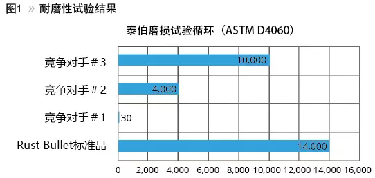 由于聚氨酯涂层的交联密度(短链和支化),它具有较高程度的耐化学介质和耐湿性,以及优异的附着力。这些性能使聚氨酯涂料定位为保护金属免受腐蚀的最佳选择。由于在这些领域弹性体涂层的性能并不很好,他们在耐磨性、耐冲击性以及保护比金属(如混凝土)具有更多伸缩运动的基材方面更为优异。Rust Bullet涂层显示有优异的柔韧性、耐冲击性和耐磨性(图1)。