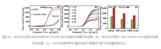 其中,单质镍的超小尺寸为其催化性能的提升提供了大量的活性位点,石墨烯的存在极大限制了其在催化过程中的再生长和聚集。实验表明,该材料在甲醇氧化电催化应用中展现出了超高的质量比活性(1600mA/mg)和优良的稳定性,循环1000次后,单质镍依旧保持原来的尺寸和形貌,没有发生聚集和二次生长。