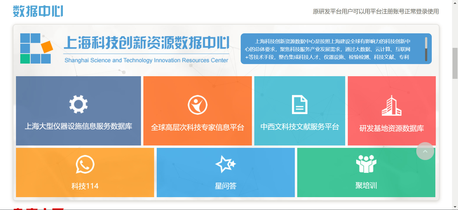 首页往下拉,可以看到数据中心,包括上海的大型仪器、专家库、中西文科技文献服务平台等。下载万方文献调用的就是中西文科技文献服务平台的数据了。