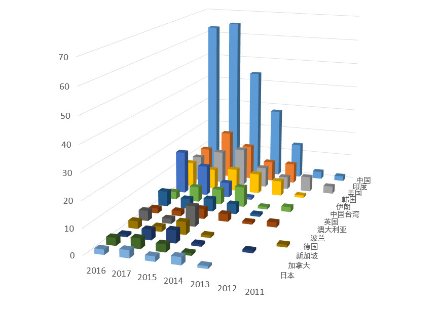 ▲ 图1 主要国家/地区石墨烯防腐涂料技术专利申请量年度分布