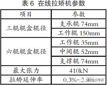 在线平整机和拉矫机串联配置,可实现2B、2D两种表面产品消除屈服平台,提升板形精度的个性化需求。平整采用两辊干式平整机,其主要参数如表5所示。拉矫机为一拉两矫式,共3对辊盒,上辊盒可以活动,下辊盒固定,分为三辊辊盒和六辊辊盒。六辊辊盒包括1根工作辊,2根中间辊和3根支撑辊。三辊辊盒包括1工作辊和2个支撑辊。其中1号辊盒为六辊,2、3号为三辊。