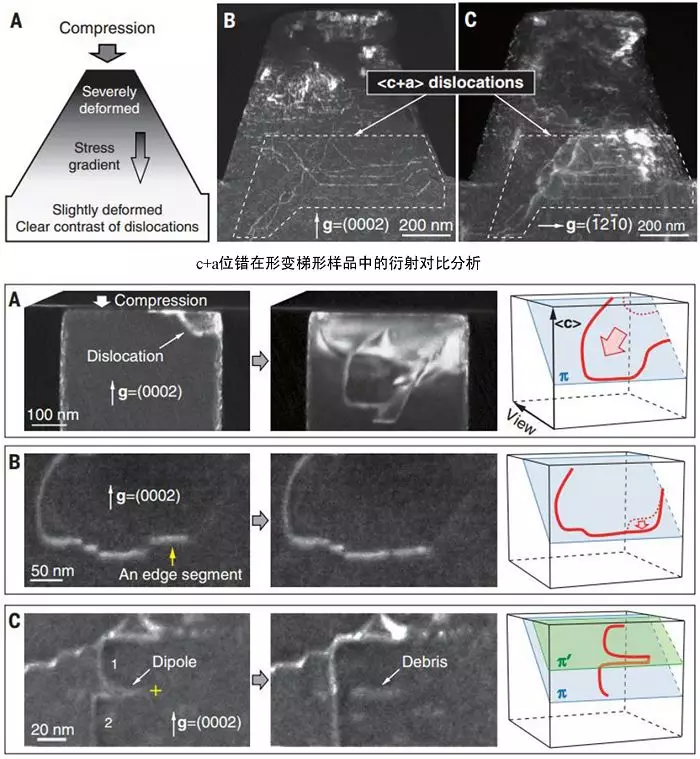 西安交大单智伟等人在《Science》期刊上发表名为《Large plasticity in magnesium mediated by pyramidal dislocations》的论文,主要研究了通过锥面<c+a>滑移调节镁合金的塑性;镁合金密度小,是非常典型的轻质合金,其密度是铝的75%,钢的35%,在自动化工业,航空航天工业,汽车车轮等具有广泛的应用。由于质量轻,可以大大减少能源的浪费。但是镁合金非常差的塑性是限制其大规模应用的主要瓶颈。镁合金具有密排六方结构,通常变形情况下,其<c+a>位错难以启动或者容易变为不可动结构,导致其塑性非常低。<c+a>位错能够调节沿着c轴方向的塑性应变和滑移路径,其滑移面为{10-11}和{11-22}。该研究首先使圆柱状的镁单晶与原位透射压柱的偏离角大于5°(以便使得<c>和<a>位错和孪晶难以启动)对其进行压缩,通过来分析位错的柏氏矢量。研究发现位错从柱顶区开始依次产生,并逐渐向柱底扩展。随着柱的进一步变形,由于密度过高,个别位错难以成像;很难分析这些位错的Burgers向量。为此,他们换成梯形样品,试验后发现了<c+a>位错的形核和滑移。实验中观察到的位错呈半圆环和“Z”字形状,包含刃型位错、螺型位错和混合型位错,figure 2。主要分解为如下两类:
