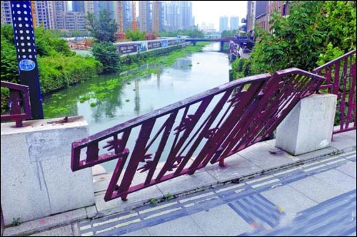 江苏无锡茂新桥一段桥栏失踪后,12日早晨,桥梁养护部门从古运河将跌落的桥栏打捞上岸,并将豁口封住,以免行人出现意外。但没过多久,有市民在桥上围观时,不小心轻轻碰到了两处栏杆,其中一处掉落桥下,另一处悬在了桥边。