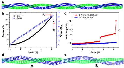 图五:图(a)为由分别为(8,0)-(9, 0)-0°(绿色)和(5,5)-(9,0)35.96°(蓝色)的两条碳纳米管组成的碳纳米管纤维模型。图(b)为碳纳米管纤维的应变能和拉应力对应变的关系曲线图。图(c)为含有七边形缺陷的(5,5)-(9,0)碳纳米管的最长的C?C键的长度与应变的关系曲线图。图(d)和(e)分别为(5,5)-(9,0)碳纳米管纤维断裂前和断裂后的快照。