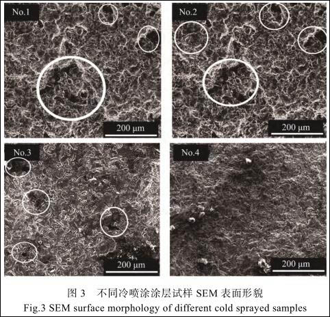 图 3 是不同冷喷涂涂层试样的微观表面形貌。从图 3 可以看出, 所有涂层的相邻纯铝粒子紧密结合,粒子变形充分,粉末粒子未发生熔化,互相之间以机械结合为主, 且没有裂纹、 分层等现象存在,但涂层的致密性存在较大差异。 No.1、 No.2 和 No.3试样微观下可以看到较多孔隙, 这些孔隙的存在能够成为腐蚀介质的快速通道, 腐蚀介质穿过孔隙到达涂层内部或涂层与基体界面,加速涂层的失效,降低其耐腐蚀性能。No.4 涂层几乎看不到微小孔洞的存在,具有良好的完整性,能够有效隔绝腐蚀介质腐蚀基体。
