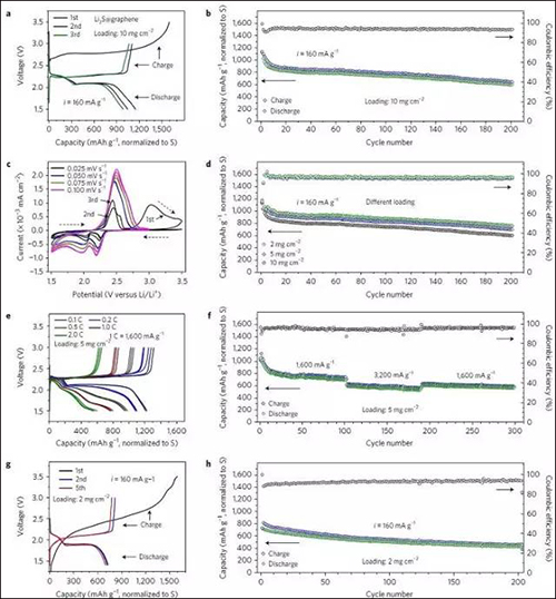 g)- h)石墨//Li2S@graphene电池对应的电化学测试曲线:g) Li2S@graphene电池的CV图;h) Li2S@graphene电池的循环特性。