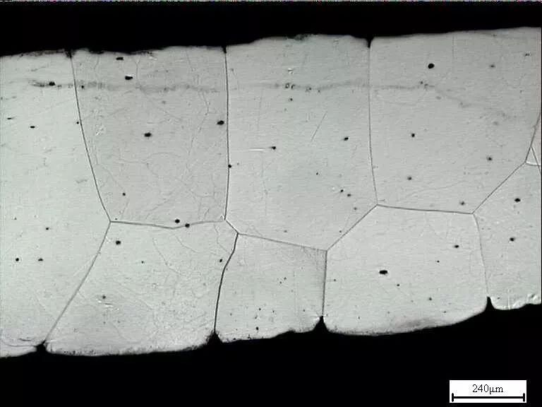 一般来说,奥氏体晶粒在较高温度下会长大,由于晶粒长大,晶界也变得相对较粗大。从试验结果来看,电除尘器极线服役现场的温度可能相当高。粗大的奥氏体晶粒在氧化腐蚀环境中容易发生开裂,因而极线表面局部区域出现沿奥氏体晶界向内扩展的裂纹。