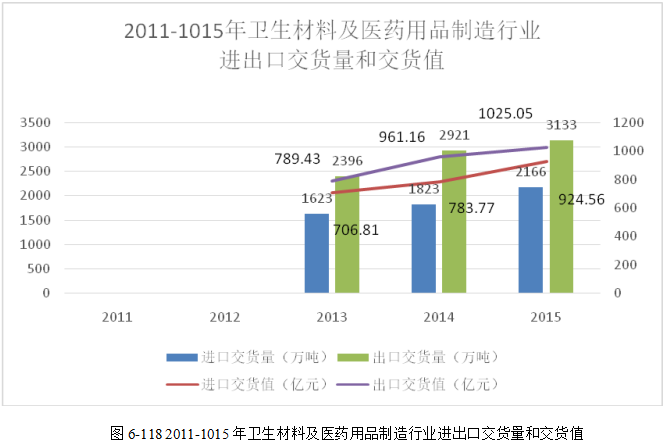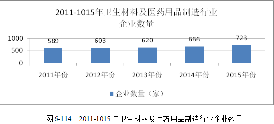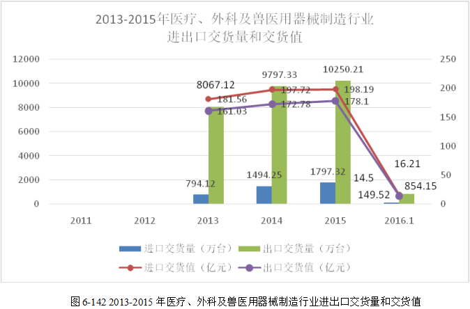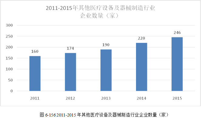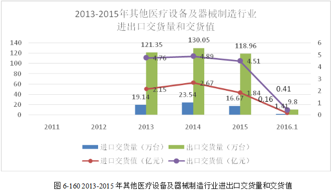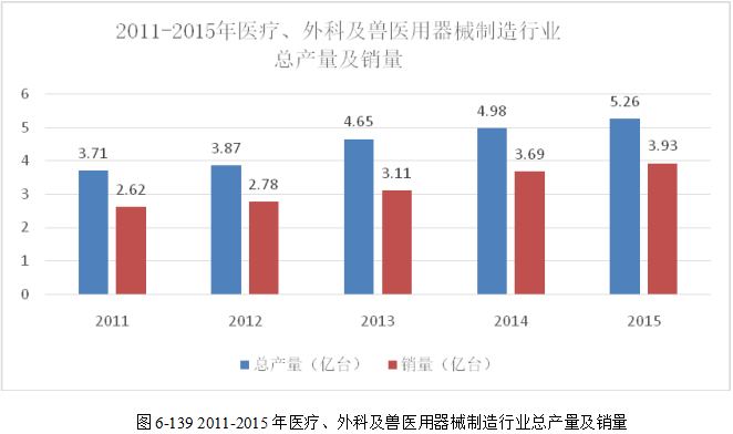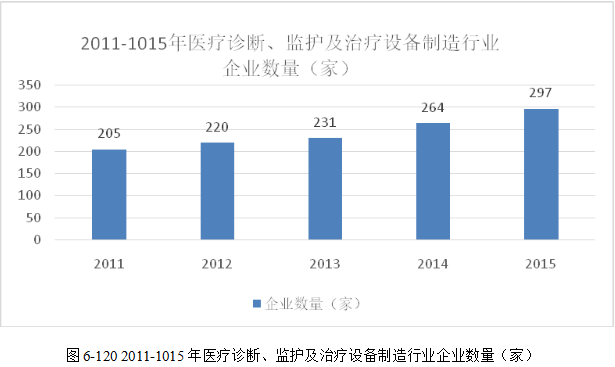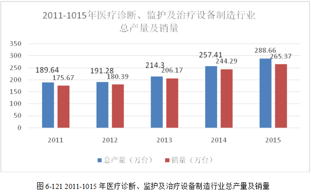根据图6-120和图6-121可知,这近五年内,医疗诊断、监护及治疗设备制造行业的企业数量持续增长,到2015年企业产量达到2011年的1.5倍。同时,总产量及销量也保持持续增长。