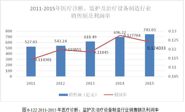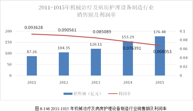 机械治疗及病房护理设备制造行业的销量增长对应着销售额的增长,但是利润率却一直下降,到2015年降低至0.0681%。