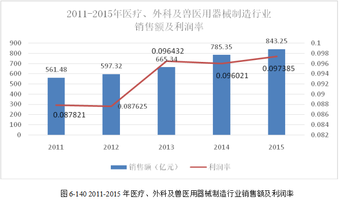 医疗、外科及兽医用器械制造行业的销量增长对应着销售额的增长,但是利润率在2013年增幅较大后保持一定范围内波动。
