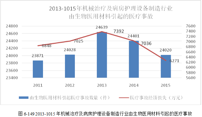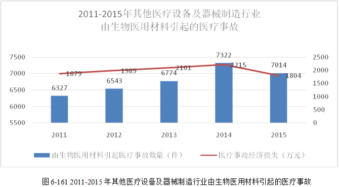 根据图6-125可知,2012年事故数量略有增加之后持续减少,尤其2014年和2015年急剧减少,同时医疗事故经济损失趋势与事故数量的变化趋势一致。2015年当年医院的采购量高达205.22万台,而这类监护治疗设备较贵,包括临床监护类设备,超声影像类设备,心电生理类设备、放射治疗类,激光治疗类,物理治疗类领域。一台质量过关的心电测量仪均价在7000元左右,在潮湿的空气中电路极易腐蚀而造成短路,缩短仪器的寿命。2015年医疗诊断、监护及治疗设备制造行业由生物医用材料引起的医疗事故达到3万多件,如果能够做好防腐措施,引起的医疗事故将大大减少。