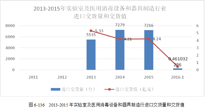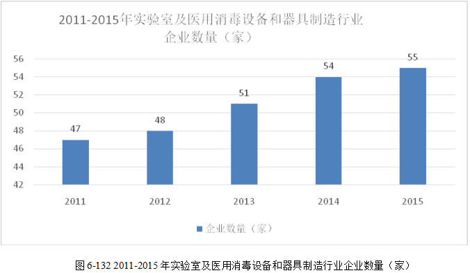 根据图6-132和图6-133可知,这近五年内,实验室及医用消毒设备和器具制造行业的企业数量持续增长,同时,总产量及销量也保持持续增长。