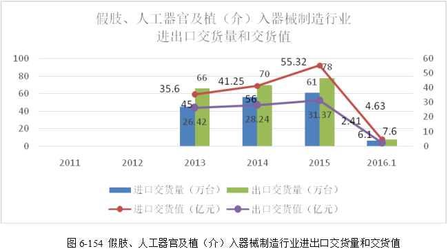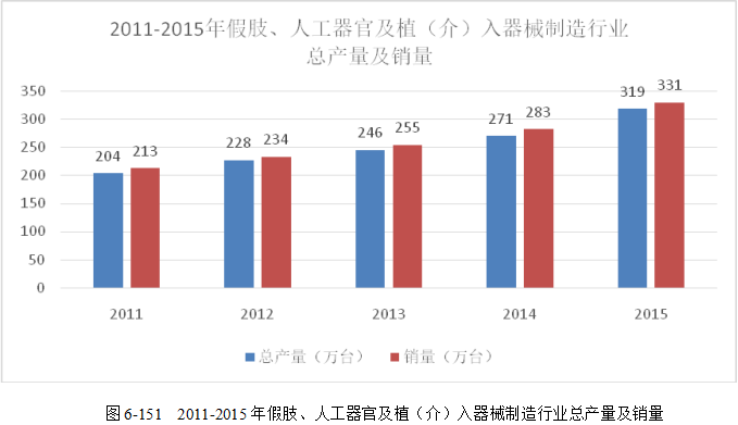 根据图6-150和图6-151可知,这近五年内,假肢、人工器官及植(介)入器械制造行业的企业数量一直持续增长,同时,总产量及销量也保持持续增长。值得注意的是,每年的销量都要高于同年的总产量。