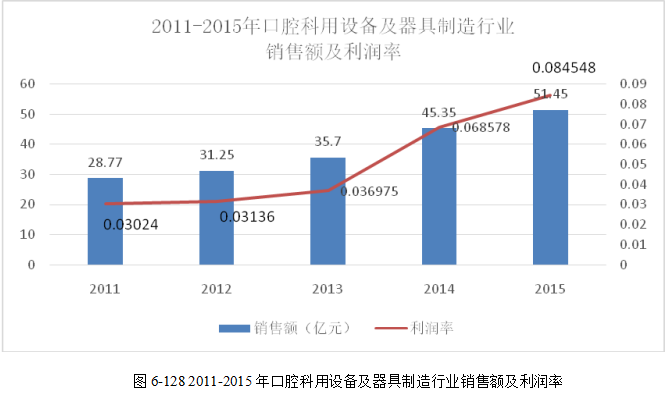 腔科用设备及器具制造行业的销量增长对应着销售额的增长,且利润率在2011年~2015年之间持续增长,且在2014年利润率达到最高为0.0686%,增幅较大,到2015年利润率达到0.0845%。