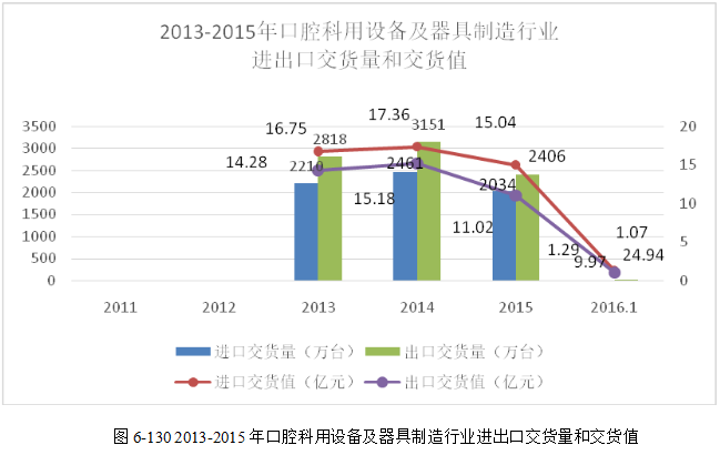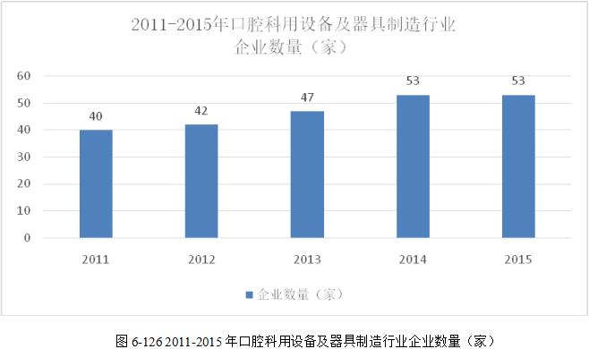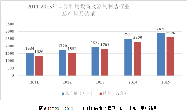 根据图6-126和图6-127可知,这近五年内,口腔科用设备及器具制造行业的企业数量持续增长,同时,总产量及销量也保持持续增长。到2015年,当年的总产量及销量几乎为2011年的两倍。