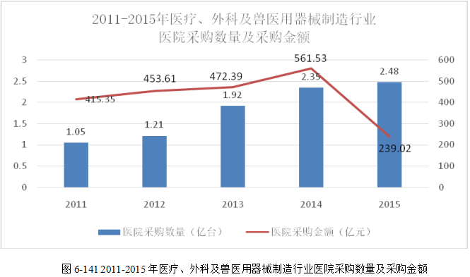 医院是医疗、外科及兽医用器械制造行业产品的主要消耗地,且医院采购数量持续增长,但是采购金额在前四年持续增长后大幅度降低。