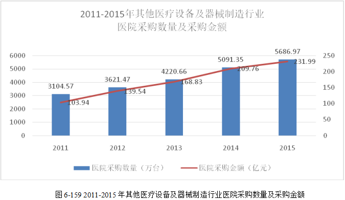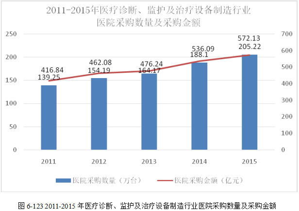 医院是医疗诊断、监护及治疗设备制造行业产品主要消耗地,医院采购数量在2011年不到行业总产量的一半,之后持续增长,到2015年当年的采购量超过205.22万台为当年总产量的三分之二。
