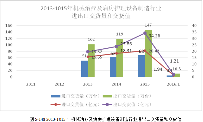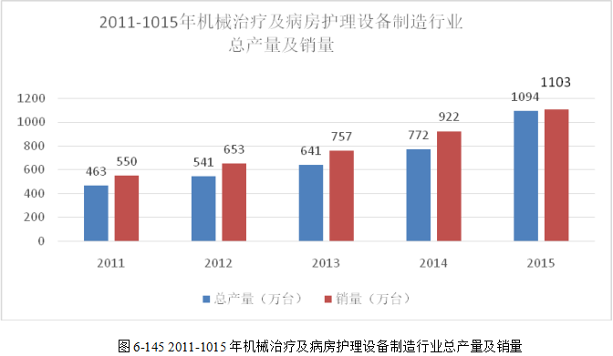 根据图6-144和图6-145可知,这近五年内,机械治疗及病房护理设备制造行业的企业数量一直持续增长,同时,总产量及销量也保持持续增长。值得注意的是,每年的销量都要高于同年的总产量。