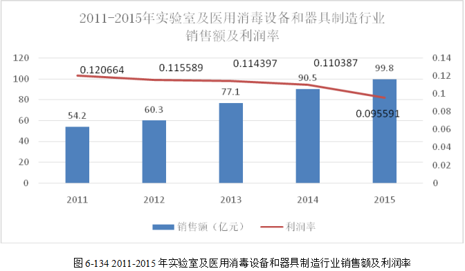实验室及医用消毒设备和器具制造行业的销量增长对应着销售额的增长,但是利润率不增反减,到2015年,利润率减少到0.0956%。