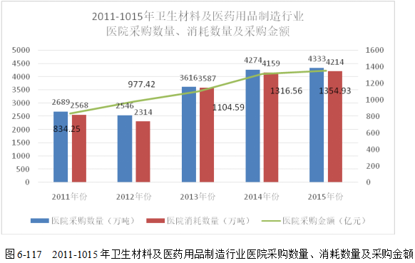 卫生材料及医药用品制造行业的产品主要消耗地是医院,医院采购的数量大概占了总产量的一半,在2012年略有下降,之后持续增多。