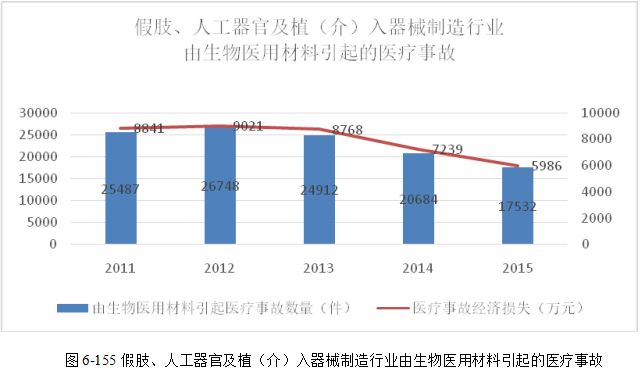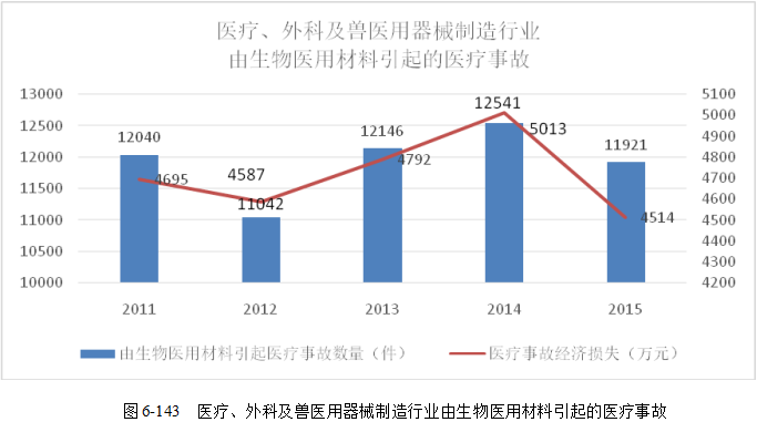 根据图6-119可知,由生物医用材料引起的医疗事故逐年增加。2015年医院消耗卫生材料及医药用品1317.14亿,其中因医疗事故经济损失9012万。可见因医疗事故经济损失占消耗品的0.6842%。