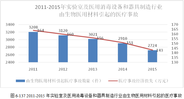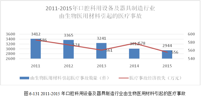 根据图6-1312可知,五年内事故数量持续减少,医疗事故经济损失除在2014年略有增加外,基本成减少趋势。2015年口腔科用设备及器具制造行业医院采购数量达到1926万台,由生物医用材料引起的医疗事故达到2944件,受腐蚀损耗比为0.1529%。