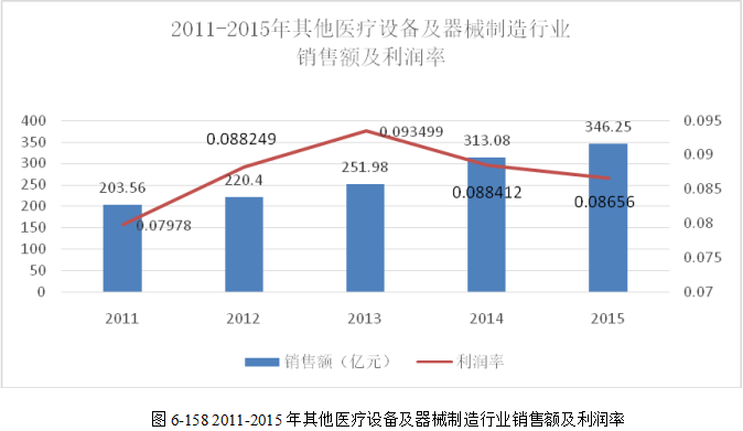 其他医疗设备及器械制造行业的销量增长对应着销售额的增长,但是利润率先增高后减少,在2013年达到峰值0.0935%。